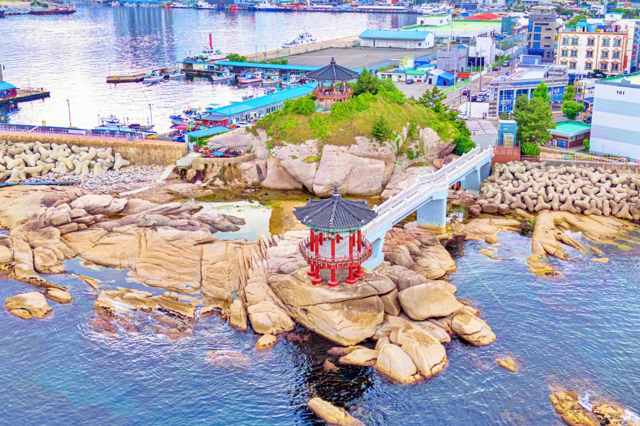 영금정은 속초 동명항의 끝자락에 자리 잡고 있으며, 항구와 바다가 만나는 지점에 위치한 전망 명소다. 바다와 바위 언덕 위에 각각 정자가 설치되어 있어, 서로 다른 높이와 시점에서 다양한 경관을 감상할 수 있는 장점이 있다. 이러한 특성 덕분에 방문객들은 한 곳에서 여러 장면을 포착할 수 있다.