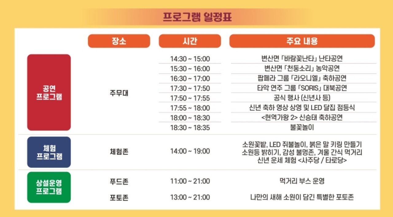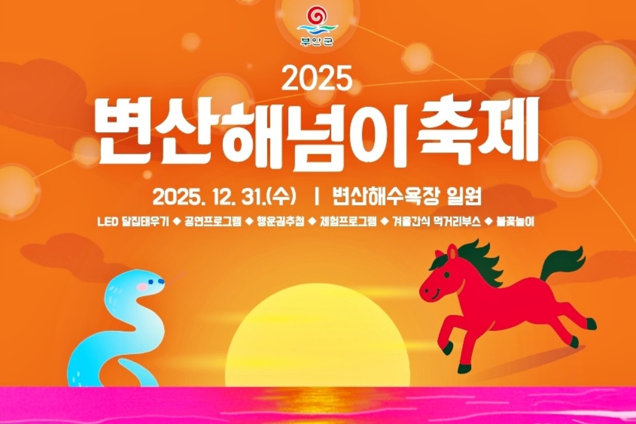 2025 변산 해넘이 축제는 12월 31일 오후 2시부터 밤 9시까지 변산해수욕장에서 진행된다. 행사 시작 전부터 푸드존과 포토존이 운영되어 방문객들의 즐거움을 더할 전망이다. 입장료와 주차비는 무료로 제공된다.